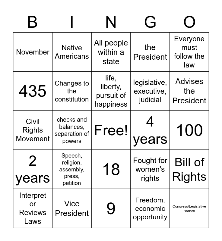 This bingo card has a free space and 38 words: The Constitution, Sets up the Government, We The People, Changes to the constitution, Bill of Rights, Speech, religion, assembly, press, petition, life, liberty, pursuit of happiness, you can practice any or no religion, Everyone must follow the law, legislative, executive, judicial, checks and balances, separation of powers, the President, Congress/Legislative Branch, 100, 435, 2 years, 6 years, All people within a state, Based on the number of people in a state, 4 years, November, Vice President, Advises the President, Interpret or Reviews Laws, Supreme Court, 9, Print Money and declare War, Provide schools, police, fire, St. Paul, Democrats and Republicans, Serve on a jury or vote, 18, Freedom, economic opportunity, Native Americans, Slavery and states rights, Fought for women's rights, Civil Rights Movement and Ojibwe and Dakota.