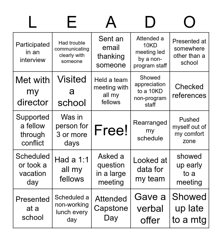 This bingo card has a free space and 24 words: Had a 1:1 all my fellows, Scheduled a non-working lunch every day, Held a team meeting with all my fellows, Presented at a school, Presented at somewhere other than a school, Participated in an interview, Met with my director, Had trouble communicating clearly with someone, Rearranged my schedule, Asked a question in a large meeting, Showed appreciation to a 10KD non-program staff, Supported a fellow through conflict, Looked at data for my team, showed up early to a meeting, Visited a school, Gave a verbal offer, Pushed myself out of my comfort zone, Sent an email thanking someone, Checked references, Was in person for 3 or more days, Showed up late to a mtg, Scheduled or took a vacation day, Attended a 10KD meeting led by a non-program staff and Attended Capstone Day.