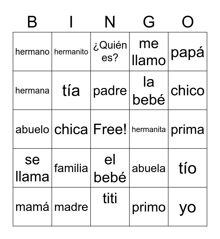 This bingo card has a free space and 24 words: familia, madre, padre, mamá, papá, hermano, hermana, hermanito, hermanita, el bebé, la bebé, abuelo, abuela, tío, tía, primo, prima, ¿Quién es?, chico, chica, yo, se llama, me llamo and titi.