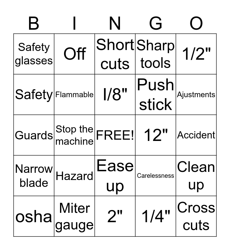 This bingo card has a free space and 24 words: Hazard, Miter gauge, I/8", osha, 1/2", Safety glasses, Safety, Off, 12", Ease up, Push stick, Guards, Carelessness, Clean up, Flammable, 1/4", Accident, Short cuts, Ajustments, Stop the machine, Cross cuts, Narrow blade, Sharp tools and 2".