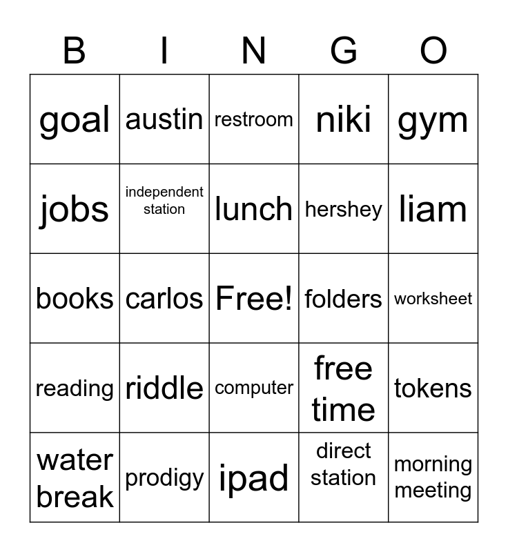 This bingo card has a free space and 59 words: ixl, prodigy, math, reading, direct station, collaboration station, independent station, robin, hershey, ingrid, niki, shop, jobs, be your best, go noodle, goal, morning meeting, gym, recess, lunch, folders, restroom, water break, tokens, calendar, money game, star chart, zones, liam, jullian, jamian, yaniel, ben, taeya, austin, bella, cooper, carlos, break time, books, spelling, riddle, worksheet, make up minutes, fun friday, pizza, movie, pencil box, computer, ipad, level, games, flashcards, learning, outside, free time, point sheet, on task and 206.