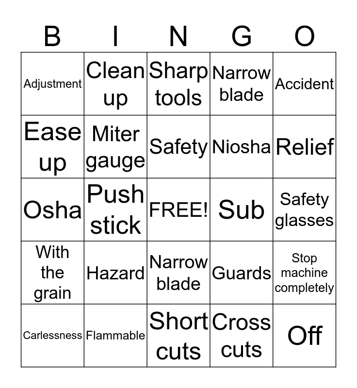 This bingo card has a free space and 24 words: Hazard, Flammable, Safety, Carlessness, Accident, Adjustment, Ease up, Clean up, Sub, Narrow blade, Niosha, Osha, Guards, Stop machine completely, Miter gauge, Cross cuts, Safety glasses, Sharp tools, Relief, Push stick, Off, With the grain, Narrow blade and Short cuts.