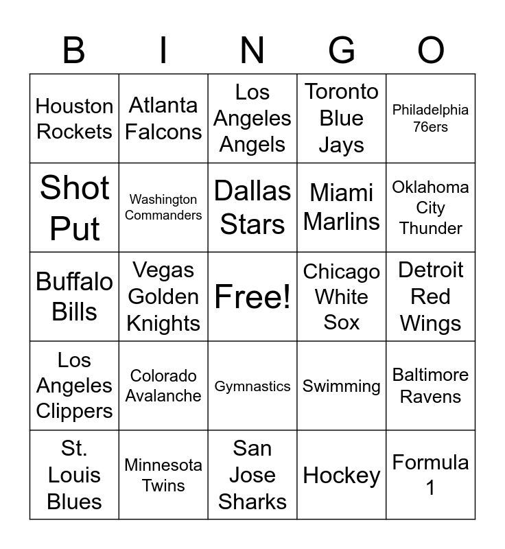 This bingo card has a free space and 179 words: Arizona Diamonbacks, Atlanta Braves, Baltimore Orioles, Boston Red Sox, Chicago White Sox, Chicago Cubs, Cincinnati Reds, Cleveland Indians, Colorado Rockies, Detroit Tigers, Houston Astros, Kansas City Royals, Los Angeles Angels, Los Angeles Dodgers, Miami Marlins, Milwaukee Brewers, Minnesota Twins, New York Yankees, New York Mets, Oakland Athletics, Philadelphia Phillies, Pittsburgh Pirates, San Diego Padres, San Francisco Giants, Seattle Mariners, St. Louis Cardinals, Tampa Bay Rays, Texas Rangers, Toronto Blue Jays, Washington Nationals, Atlanta Hawks, Boston Celtics, Brooklyn Nets, Charlotte Hornets, Chicago Bulls, Cleveland Cavaliers, Dallas Mavericks, Denver Nuggets, Detroit Pistons, Golden State Warriors, Houston Rockets, Indiana Pacers, Los Angeles Clippers, Los Angeles Lakers, Memphis Grizzlies, Miami Heat, Milwaukee Bucks, Minnesota Timberwolves, New Orleans Pelicans, New York Knicks, Oklahoma City Thunder, Orlando Magic, Philadelphia 76ers, Phoenix Suns, Portland Trail Blazers, Sacramento Kings, San Antonio Spurs, Toronto Raptors, Utah Jazz, Washington Wizards, Arizona Cardinals, Atlanta Falcons, Baltimore Ravens, Buffalo Bills, Carolina Panthers, Chicago Bears, Cincinnati Bengals, Cleveland Browns, Dallas Cowboys, Denver Broncos, Detroit Lions, Green Bay Packers, Houston Texans, Indianapolis Colts, Jacksonville Jaguars, Kansas City Chiefs, Las Vegas Raiders, Los Angeles Chargers, Los Angeles Rams, Miami Dolphins, Minnesota Vikings, New England Patriots, New Orleans Saints, New York Giants, New York Jets, Philadelphia Eagles, Pittsburgh Steelers, San Francisco 49ers, Seattle Seahawks, Tampa Bay Buccaneers, Tennessee Titans, Washington Commanders, Anaheim Ducks, Arizona Coyotes, Boston Bruins, Buffalo Sabres, Calgary Flames, Carolina Hurricanes, Chicago Blackhawks, Colorado Avalanche, Columbus Blue Jackets, Dallas Stars, Detroit Red Wings, Edmonton Oilers, Florida Panthers, Los Angeles Kings, Minnesota Wild, Montreal Canadiens, Nashville Predators, New Jersey Devils, New York Islanders, New York Rangers, Ottawa Senators, Philadelphia Flyers, Pittsburgh Penguins, San Jose Sharks, Seattle Kraken, St. Louis Blues, Tampa Bay Lightning, Toronto Maple Leafs, Vancouver Canucks, Vegas Golden Knights, Washington Capitals, Winnipeg Jets, Archery, Badminton, Baseball, Basketball, Bowling, Boxing, Cheerleading, Cricket, Crossfit, Curling, Cycling, Discus, Dodgeball, Fencing, Football, Formula 1, Freediving, Golf, Gymnastics, Handball, Hockey, Ice Skating, Javelin, Judo, Karate, Kickball, Lacrosse, Luge, Mixed Martial Arts, Motorcycle Racing, Mountain Biking, NASCAR, Pole Vault, Polo, Powerlifting, Racquetball, Relays, Rowing, Rugby, Sailing, Scuba Diving, Shot Put, Skateboarding, Skiing, Snowboarding, Soccer, Softball, Surfing, Swimming, Taekwondo, Tennis, Track & Field, Volleyball, Weightlifting and Wrestling.