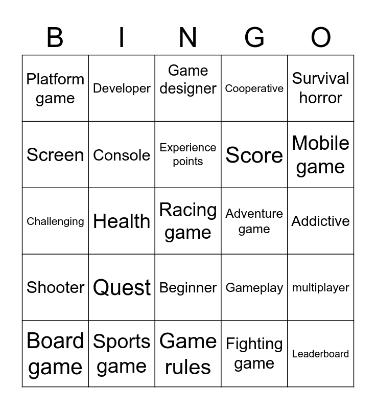 This bingo card has 25 words: Shooter, Sports game, Racing game, Fighting game, Survival horror, Platform game, Developer, Game designer, Adventure game, multiplayer, Screen, Console, Game rules, Gameplay, Mobile game, Board game, Health, Experience points, Score, Addictive, Challenging, Quest, Beginner, Cooperative and Leaderboard.
