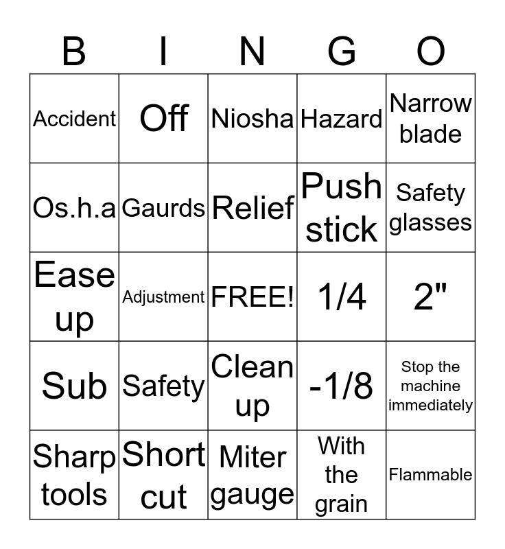This bingo card has a free space and 24 words: Safety, Short cut, Relief, Sharp tools, Narrow blade, Accident, Os.h.a, Off, 1/4, Clean up, Push stick, Ease up, -1/8, Stop the machine immediately, Gaurds, With the grain, 2", Niosha, Safety glasses, Adjustment, Flammable, Sub, Hazard and Miter gauge.