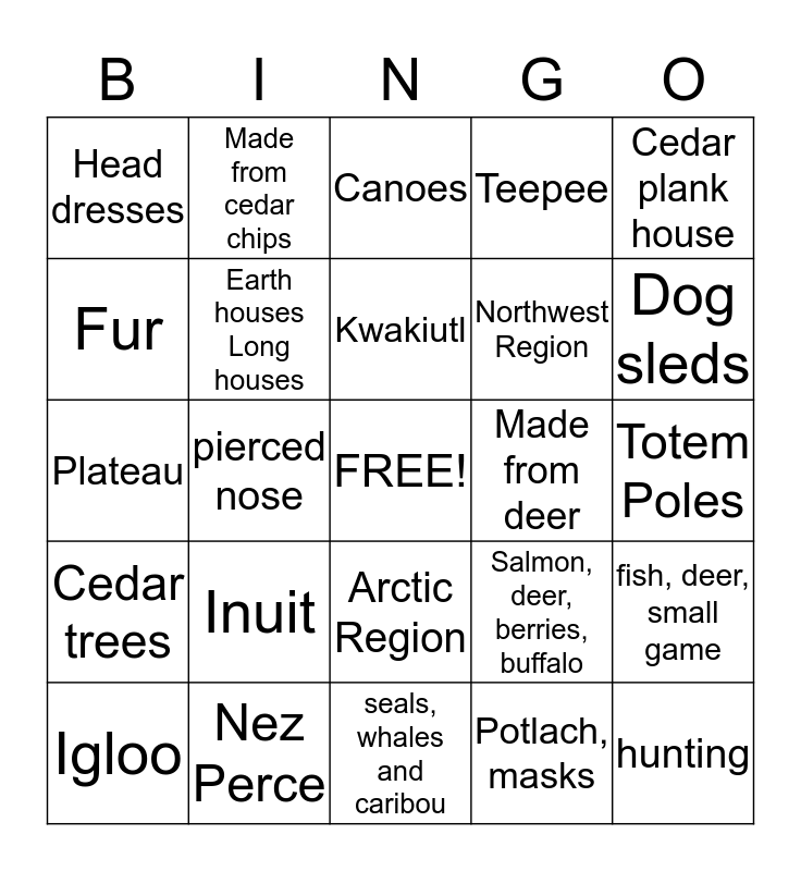 This bingo card has a free space and 24 words: Inuit, Nez Perce, Kwakiutl, Igloo, Cedar plank house, Head dresses, Fur, Made from cedar chips, Made from deer, Arctic Region, Northwest Region, Plateau, Salmon, deer, berries, buffalo, fish, deer, small game, Earth houses Long houses, Potlach, masks, Totem Poles, Canoes, Dog sleds, pierced nose, hunting, Cedar trees, Teepee and seals, whales and caribou.
