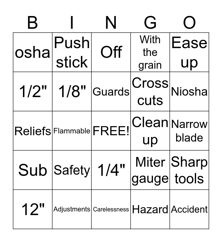 This bingo card has a free space and 24 words: Safety, Adjustments, Guards, 12", Ease up, osha, 1/2", Push stick, Clean up, 1/4", Cross cuts, Reliefs, Miter gauge, Sharp tools, 1/8", Hazard, Narrow blade, Off, Niosha, Flammable, Accident, Sub, With the grain and Carelessness.