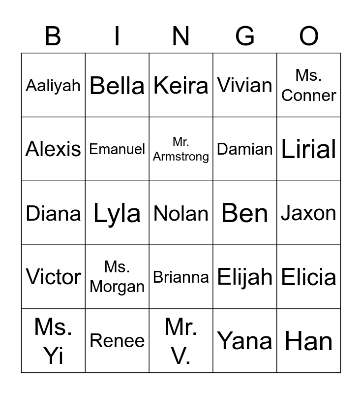 This bingo card has 25 words: Ms. Morgan, Mr. V., Mr. Armstrong, Ms. Yi, Ms. Conner, Aaliyah, Alexis, Bella, Ben, Brianna, Damian, Diana, Elijah, Elicia, Emanuel, Han, Jaxon, Keira, Lirial, Lyla, Nolan, Renee, Victor, Vivian and Yana.
