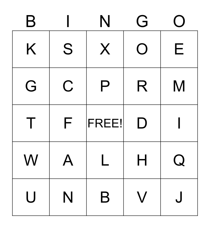 This bingo card has a free space and 24 words: A, N, P, U, E, K, G, S, D, L, R, T, H, Q, C, V, I, X, M, F, J, W, O and B.