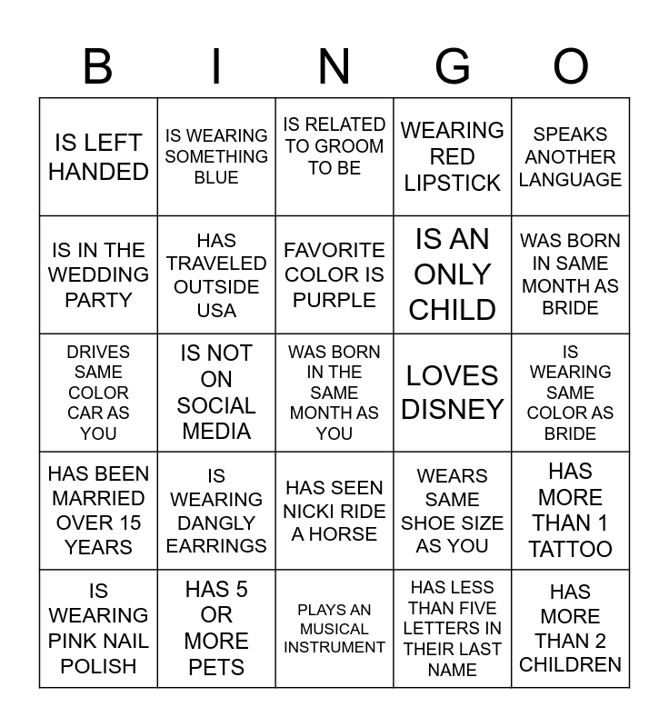 This bingo card has 25 words: HAS BEEN MARRIED OVER 15 YEARS, HAS 5 OR MORE PETS, WAS BORN IN THE SAME MONTH AS YOU, HAS LESS THAN FIVE LETTERS IN THEIR LAST NAME, SPEAKS ANOTHER LANGUAGE, IS LEFT HANDED, IS WEARING SOMETHING BLUE, IS RELATED TO GROOM TO BE, LOVES DISNEY, HAS MORE THAN 1 TATTOO, IS IN THE WEDDING PARTY, HAS TRAVELED OUTSIDE USA, PLAYS AN MUSICAL INSTRUMENT, WEARS SAME SHOE SIZE AS YOU, WAS BORN IN SAME MONTH AS BRIDE, IS WEARING PINK NAIL POLISH, IS NOT ON SOCIAL MEDIA, FAVORITE COLOR IS PURPLE, IS AN ONLY CHILD, IS WEARING SAME COLOR AS BRIDE, DRIVES SAME COLOR CAR AS YOU, IS WEARING DANGLY EARRINGS, HAS SEEN NICKI RIDE A HORSE, WEARING RED LIPSTICK and HAS MORE THAN 2 CHILDREN.