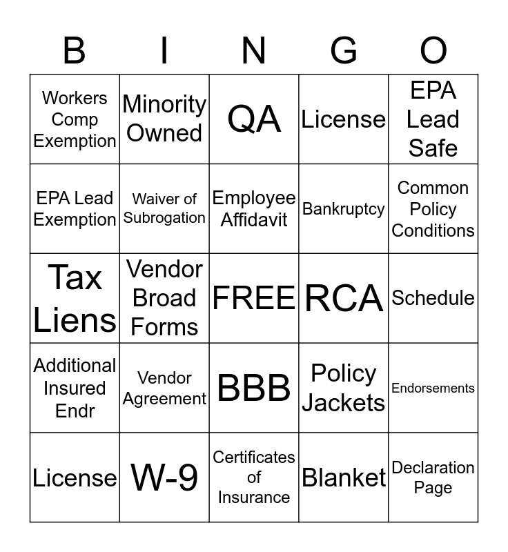 This bingo card has a free space and 24 words: Vendor Agreement, W-9, Employee Affidavit, License, EPA Lead Safe, Workers Comp Exemption, EPA Lead Exemption, Minority Owned, RCA, BBB, Bankruptcy, Tax Liens, Policy Jackets, Endorsements, Waiver of Subrogation, Blanket, Schedule, QA, Common Policy Conditions, Vendor Broad Forms, Declaration Page, Additional Insured Endr, License and Certificates of Insurance.