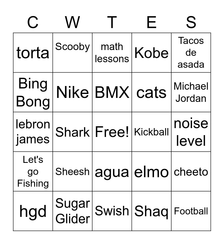This bingo card has a free space and 24 words: Sheesh, Sugar Glider, BMX, hgd, Tacos de asada, torta, Bing Bong, Scooby, Kickball, agua, cats, lebron james, elmo, cheeto, Nike, Shaq, noise level, math lessons, Michael Jordan, Shark, Football, Let's go Fishing, Kobe and Swish.