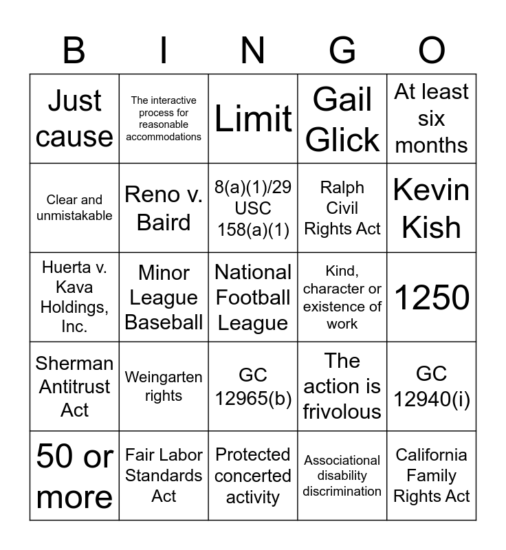 This bingo card has 25 words: Weingarten rights, Protected concerted activity, 8(a)(1)/29 USC 158(a)(1), 50 or more, At least six months, Just cause, Clear and unmistakable, The interactive process for reasonable accommodations, Kind, character or existence of work, GC 12965(b), Ralph Civil Rights Act, Huerta v. Kava Holdings, Inc., The action is frivolous, GC 12940(i), Reno v. Baird, California Family Rights Act, 1250, Limit, Kevin Kish, Minor League Baseball, National Football League, Fair Labor Standards Act, Sherman Antitrust Act, Gail Glick and Associational disability discrimination.