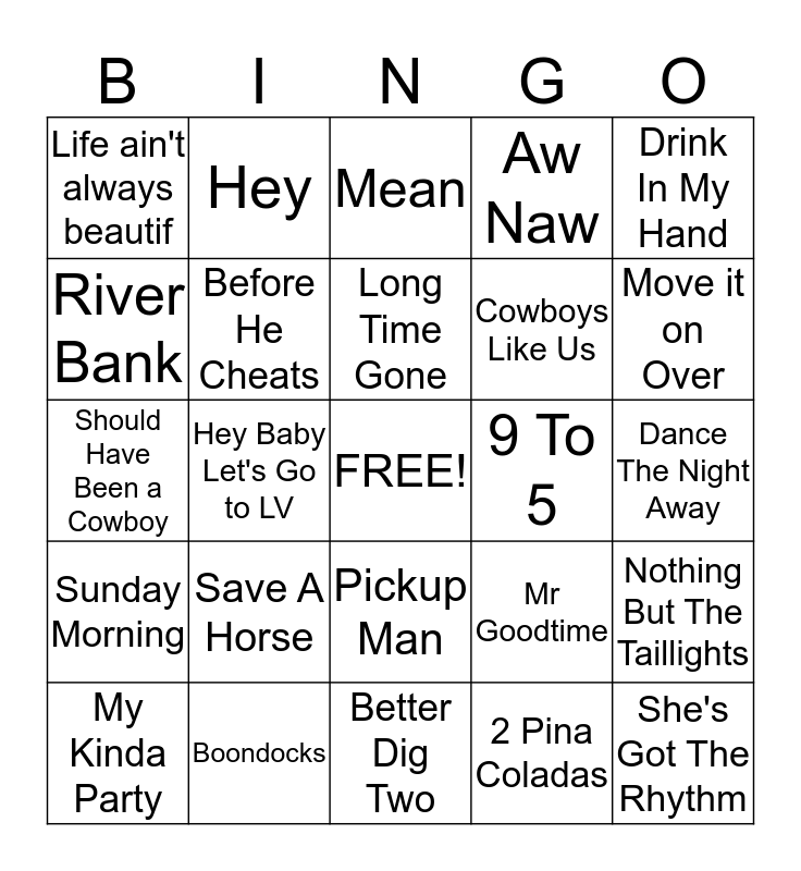 This bingo card has a free space and 48 words: If Your Gonna Play In Texas, She's Got The Rhythm, When You Say Nothing at all, Better Dig Two, Save A Horse, People Are Crazy, Hey, I can't make you love me, River Bank, Neon Moon, Before He Cheats, Aw Naw, Nothing But The Taillights, Mr Goodtime, Wagon Wheel, Drunk On A Plane, Long Time Gone, 9 To 5, Fast As You, Drink In My Hand, Hey Baby Let's Go to LV, 2 Pina Coladas, Life ain't always beautif, Cowboys Like Us, Mama Knows the Highway, Move it on Over, My Kinda Party, Heads Carolina, Pickup Man, Sunday Morning, Just to be your Man, Love somebody like you, American Kids, Love don't live here, Boondocks, Drink A Beer, Independence Day, Dance The Night Away, Kerosene, Head South, Man I Feel, Stuck Like Glue, Mean, Cowboy in Me, Should Have Been a Cowboy, I left Something Turned, Girls Gone Wild and Where The Boat Leaves.