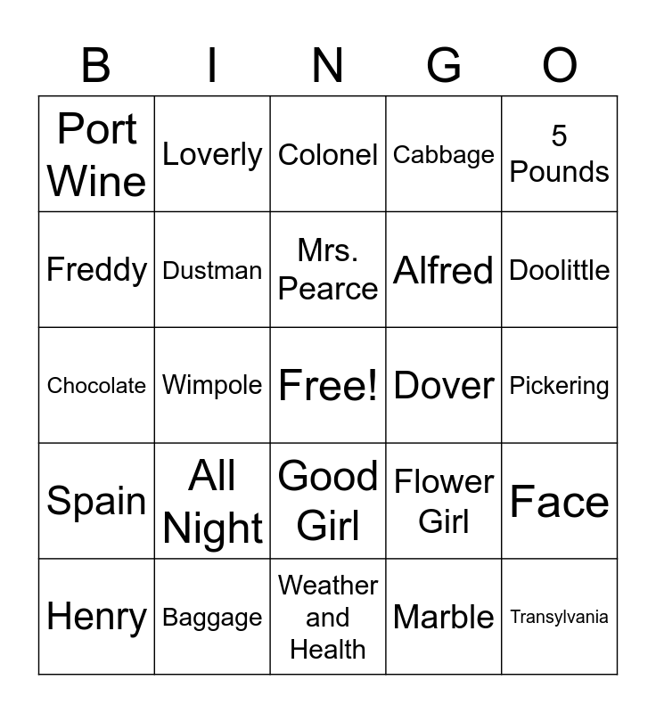 This bingo card has a free space and 30 words: Baggage, Hampshire, Wimpole, Lessons, Port Wine, Colonel, Dustman, Good Girl, Dover, Weather and Health, Pickering, Transylvania, Marble, Hungary, Doolittle, Mother, Flower Girl, Spain, All Night, 5 Pounds, Chocolate, Church, Loverly, Alfred, Freddy, Cabbage, Face, Henry, Mrs. Pearce and India.