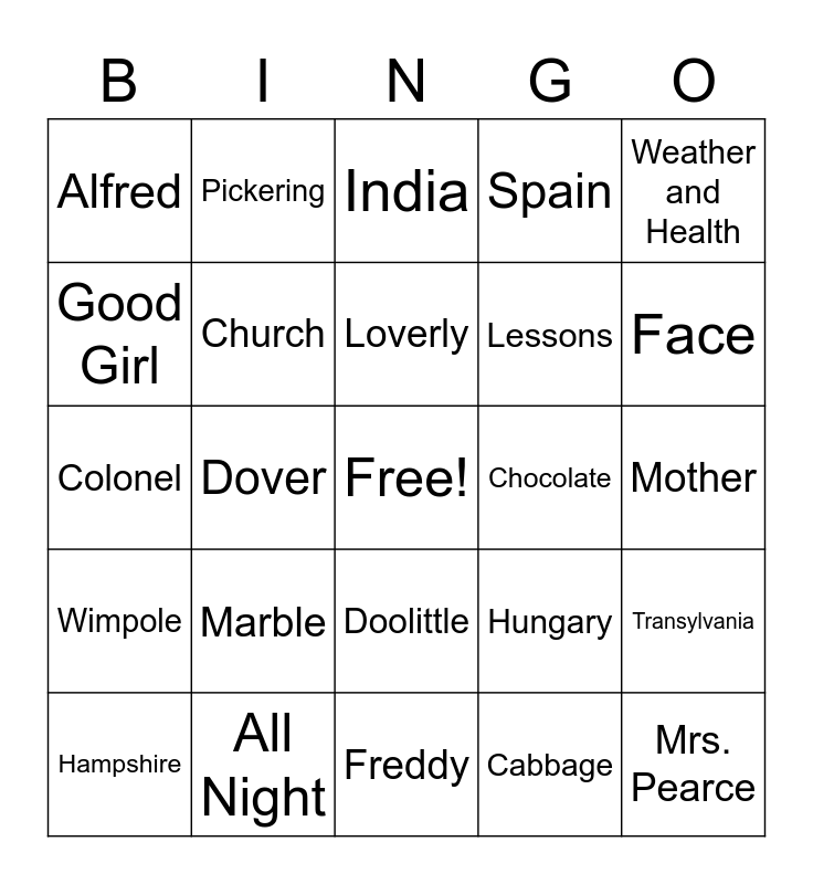 This bingo card has a free space and 30 words: All Night, Port Wine, Dover, Dustman, Alfred, India, Church, Doolittle, Chocolate, Freddy, Mother, Mrs. Pearce, Cabbage, 5 Pounds, Face, Henry, Hungary, Wimpole, Marble, Weather and Health, Colonel, Baggage, Pickering, Lessons, Good Girl, Spain, Transylvania, Hampshire, Loverly and Flower Girl.