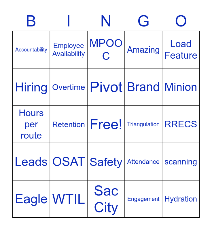 This bingo card has a free space and 63 words: Proud, 60 Min Variance, Street base, scanning, Integrity, CSV, Employee Availability, F2C Roadmap, Pivot, CSAW, Safety, Gemba, RRECS, Load Feature, Jagdeep, Hiring, Retention, Accountability, CRDO, Brand, OSAT, Leads, Amazing, Never give up, 3999, 3996, 1017, 1838, Delivering for America, 10 year plan, Click, Click, Coach, Mentor, Develop, Clock Ring Errors, Minion, Eagle, Opportunities, Engagement, Focus, Overtime, Hours per route, Triangulation, Article 8, Consecutive days, Hydration, WTIL, Customer Bliss, Attendance, Goals, Leadership, Vap-Gap, Sac City, Oakland, MPOO A, MPOO B, MPOO C, MPOO D, Work Ethic, POS Survey, Pre Tour, SDO, Uniform and Shoes.