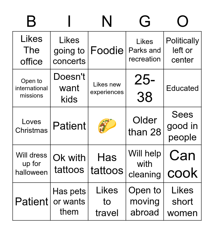 This bingo card has a free space and 24 words: Ok with tattoos, Has pets or wants them, Likes new experiences, Patient, Politically left or center, Likes The office, Open to international missions, Likes going to concerts, Older than 28, Has tattoos, 25-38, Loves Christmas, Will help with cleaning, Can cook, Doesn't want kids, Open to moving abroad, Sees good in people, Foodie, Educated, Patient, Likes short women, Will dress up for halloween, Likes Parks and recreation and Likes to travel.