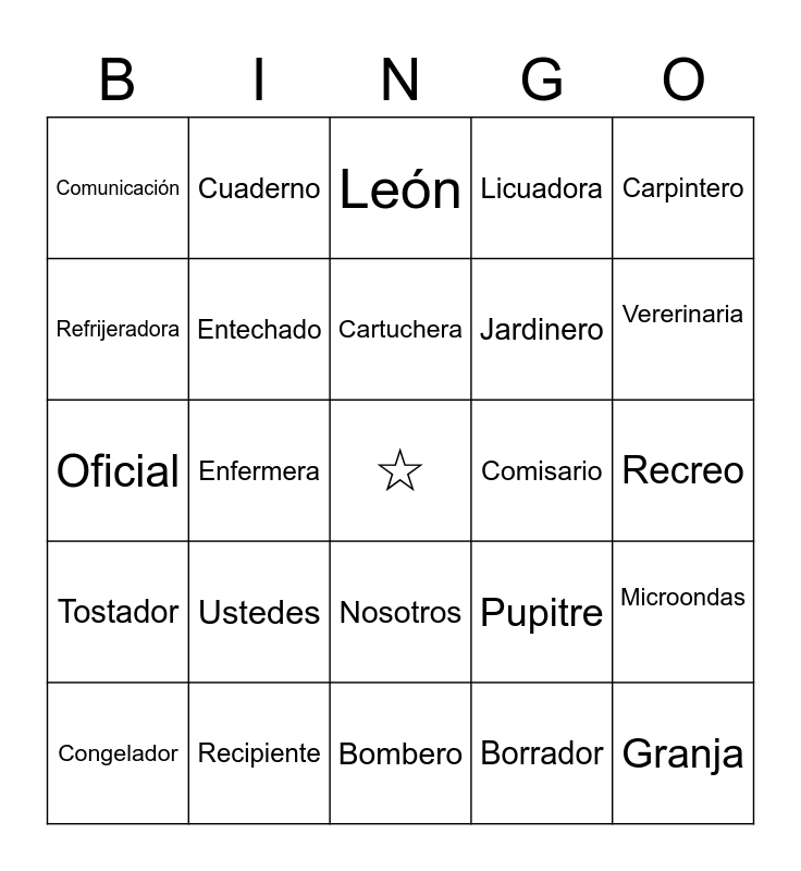 This bingo card has a free space and 58 words: Inspector, Nosotros, Lonchera, Ustedes, Borrador, Perro, Cuaderno, Tajador, Refrijeradora, Hormiga, Cartuchera, Colibri, Alimento, Tarea, Oso, Licuadora, Recreo, Comunicación, Extranjero, Bombero, Jardinero, Carpintero, Información, Recipiente, Granja, Comisario, Serpiente, Recipiente, Entechado, Cuchara, Tenedor, Cuchillo, Hospital, Dentista, Oficina, Edificio, Comunicador, Oficial, Enfermera, Estudiante, Pupitre, Microondas, Congelador, Contenedor, Estudiante, Ingeniero, Puerta, Tostador, Azucarera, Compañero, Elefante, Granja, Hipopotamo, Jirafa, León, Camaleón, Vererinaria and Paciente.
