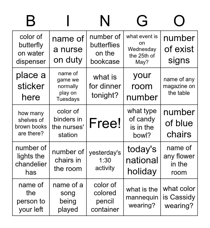This bingo card has a free space and 24 words: number of chairs in the room, name of a song being played, what is for dinner tonight?, name of the person to your left, number of exist signs, color of butterfly on water dispenser, place a sticker here, name of a nurse on duty, what type of candy is in the bowl?, yesterday's 1:30 activity, your room number, how many shelves of brown books are there?, today's national holiday, name of any flower in the room, name of game we normally play on Tuesdays, what is the mannequin wearing?, number of blue chairs, number of butterflies on the bookcase, name of any magazine on the table, color of binders in the nurses' station, what color is Cassidy wearing?, number of lights the chandelier has, what event is on Wednesday the 25th of May? and color of colored pencil container.