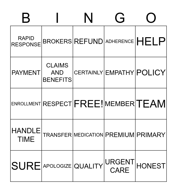 This bingo card has a free space and 24 words: TRANSFER, APOLOGIZE, CERTAINLY, SURE, HELP, RAPID RESPONSE, PAYMENT, BROKERS, MEMBER, MEDICATION, EMPATHY, ENROLLMENT, PREMIUM, PRIMARY, CLAIMS AND BENEFITS, URGENT CARE, TEAM, REFUND, POLICY, RESPECT, HONEST, HANDLE TIME, ADHERENCE and QUALITY.