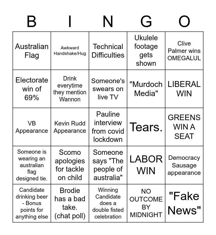 This bingo card has 25 words: Scomo apologies for tackle on child, Winning Candidate does a double fisted celebration, Someone's swears on live TV, Candidate drinking beer - Bonus points for anything else, Clive Palmer wins OMEGALUL, Australian Flag, Electorate win of 69%, Awkward Handshake/Hug, Tears., Someone says "The people of australia", "Murdoch Media", VB Appearance, LABOR WIN, Democracy Sausage appearance, Drink everytime they mention Wannon, "Fake News", GREENS WIN A SEAT, Technical Difficulties, LIBERAL WIN, Kevin Rudd Appearance, Pauline interview from covid lockdown, Brodie has a bad take. (chat poll), Someone is wearing an australian flag designed tie., Ukulele footage gets shown and NO OUTCOME BY MIDNIGHT.