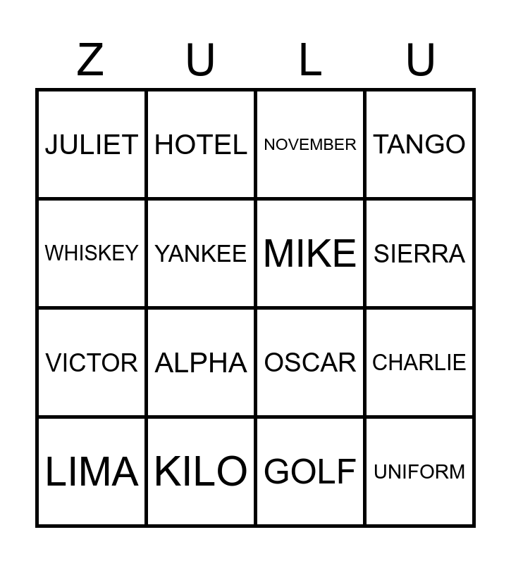 This bingo card has 26 words: DELTA, ROMEO, SIERRA, ECHO, WHISKEY, JULIET, YANKEE, HOTEL, GOLF, BRAVO, VICTOR, OSCAR, FOXTROT, ZULU, CHARLIE, X-RAY, TANGO, UNIFORM, NOVEMBER, LIMA, ALPHA, QUEBEC, KILO, PAPA, MIKE and INDIA.
