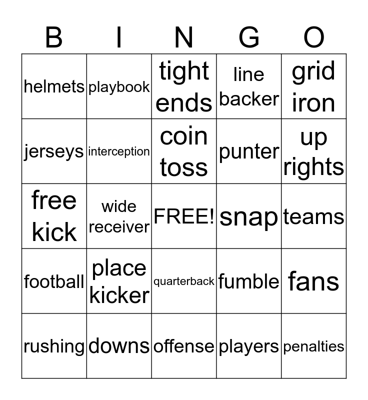 This bingo card has a free space and 24 words: place kicker, downs, coin toss, rushing, grid iron, helmets, jerseys, playbook, snap, quarterback, punter, free kick, fumble, fans, interception, players, teams, tight ends, up rights, wide receiver, penalties, football, line backer and offense.