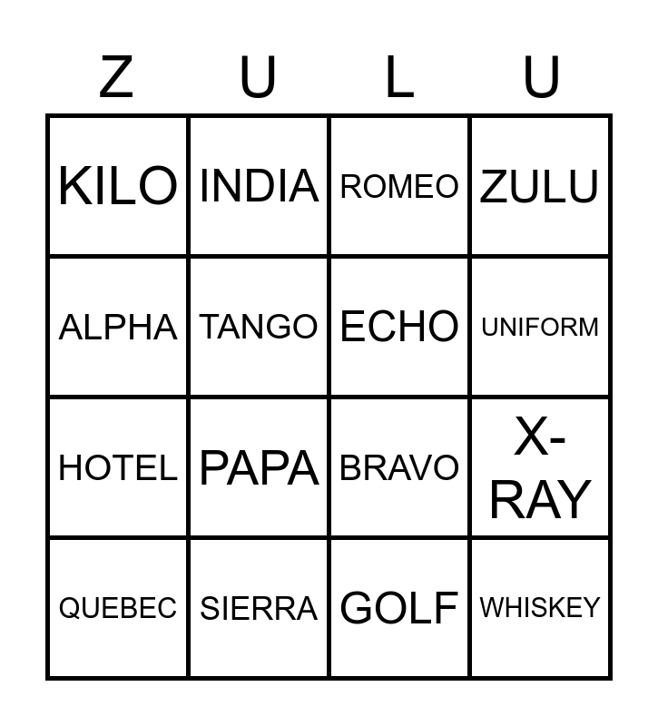 This bingo card has 26 words: VICTOR, NOVEMBER, UNIFORM, YANKEE, ALPHA, KILO, TANGO, INDIA, GOLF, OSCAR, HOTEL, BRAVO, DELTA, JULIET, X-RAY, MIKE, ZULU, WHISKEY, ROMEO, QUEBEC, PAPA, FOXTROT, SIERRA, CHARLIE, ECHO and LIMA.