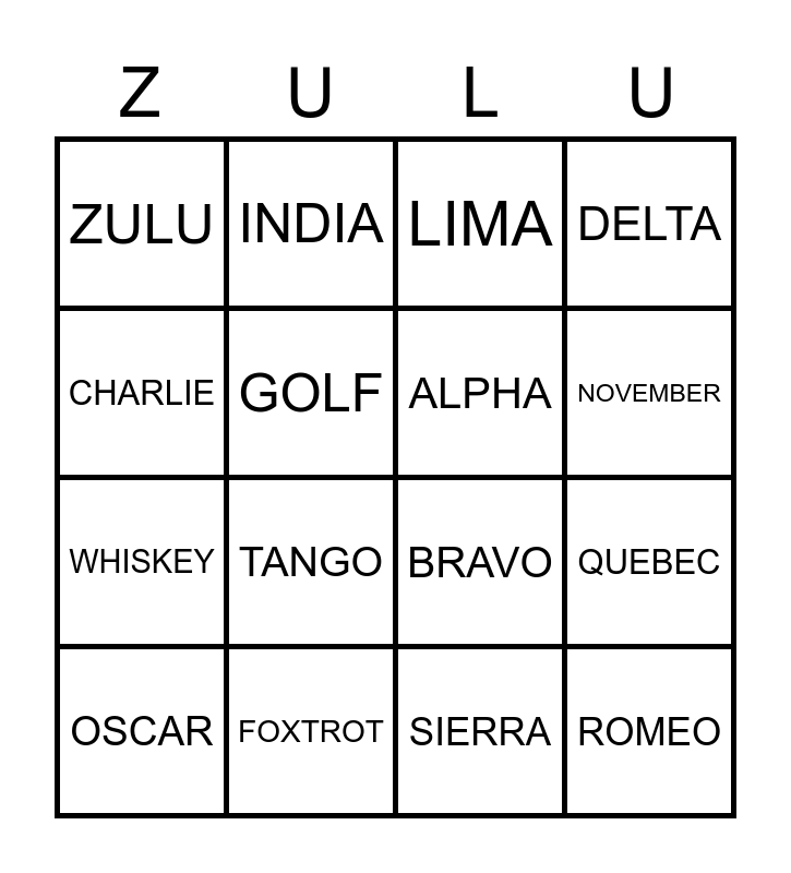 This bingo card has 26 words: HOTEL, UNIFORM, NOVEMBER, JULIET, CHARLIE, ZULU, GOLF, INDIA, SIERRA, VICTOR, WHISKEY, BRAVO, ECHO, YANKEE, QUEBEC, X-RAY, DELTA, ROMEO, LIMA, OSCAR, TANGO, KILO, FOXTROT, PAPA, ALPHA and MIKE.