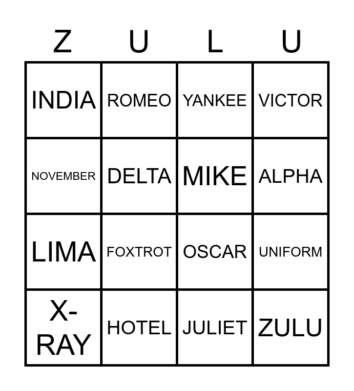 This bingo card has 26 words: CHARLIE, WHISKEY, ALPHA, QUEBEC, NOVEMBER, INDIA, DELTA, ROMEO, JULIET, PAPA, LIMA, OSCAR, KILO, GOLF, UNIFORM, TANGO, VICTOR, ZULU, YANKEE, X-RAY, FOXTROT, ECHO, HOTEL, BRAVO, MIKE and SIERRA.