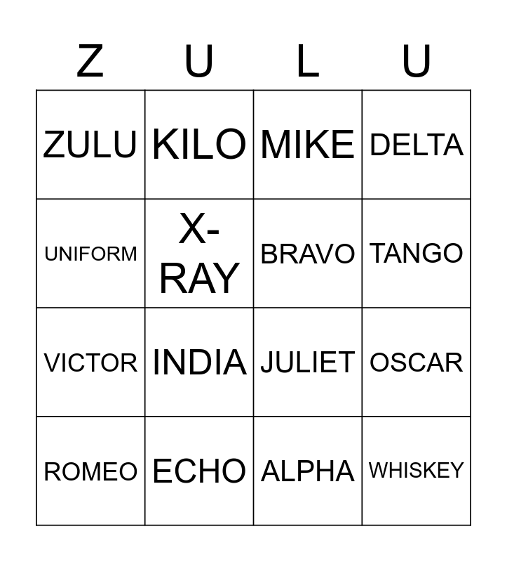 This bingo card has 26 words: CHARLIE, GOLF, TANGO, NOVEMBER, UNIFORM, ZULU, X-RAY, KILO, ALPHA, SIERRA, VICTOR, JULIET, PAPA, FOXTROT, OSCAR, QUEBEC, DELTA, WHISKEY, MIKE, ROMEO, INDIA, YANKEE, ECHO, LIMA, BRAVO and HOTEL.