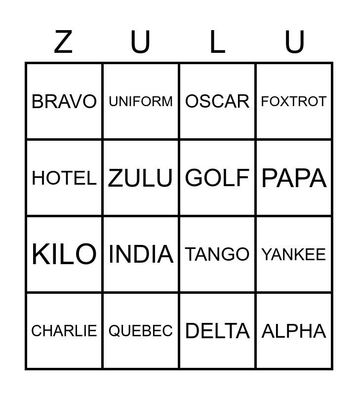 This bingo card has 26 words: WHISKEY, SIERRA, PAPA, ROMEO, HOTEL, BRAVO, ZULU, UNIFORM, DELTA, MIKE, KILO, TANGO, LIMA, X-RAY, YANKEE, ECHO, FOXTROT, ALPHA, OSCAR, CHARLIE, INDIA, JULIET, QUEBEC, VICTOR, GOLF and NOVEMBER.