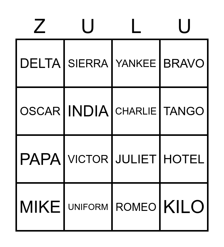 This bingo card has 26 words: ZULU, FOXTROT, TANGO, QUEBEC, OSCAR, DELTA, INDIA, SIERRA, ROMEO, GOLF, PAPA, JULIET, NOVEMBER, X-RAY, HOTEL, LIMA, BRAVO, KILO, YANKEE, MIKE, VICTOR, WHISKEY, UNIFORM, ECHO, CHARLIE and ALPHA.