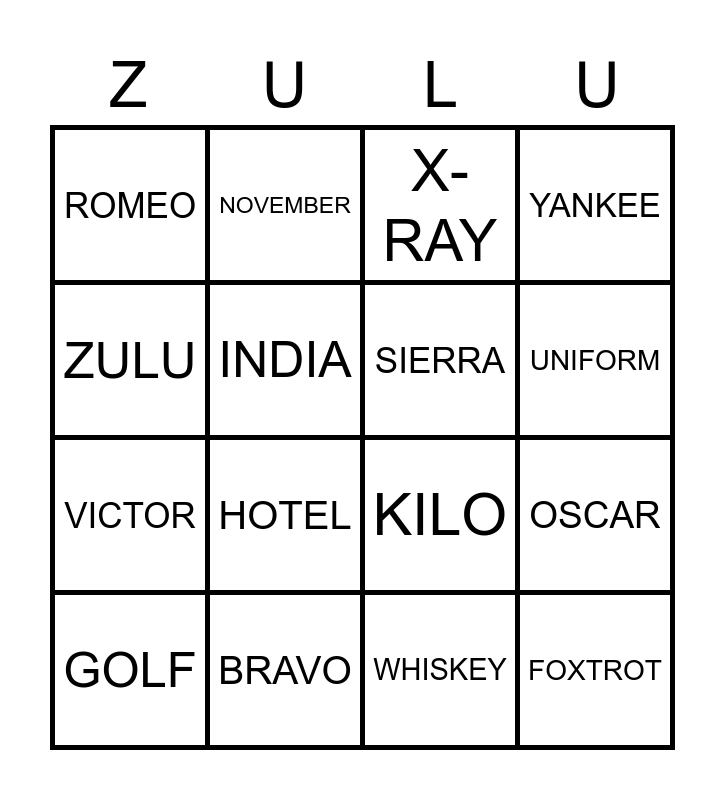 This bingo card has 26 words: PAPA, MIKE, UNIFORM, ECHO, ZULU, ROMEO, INDIA, NOVEMBER, WHISKEY, CHARLIE, VICTOR, KILO, JULIET, ALPHA, OSCAR, LIMA, YANKEE, FOXTROT, X-RAY, GOLF, HOTEL, QUEBEC, BRAVO, TANGO, SIERRA and DELTA.