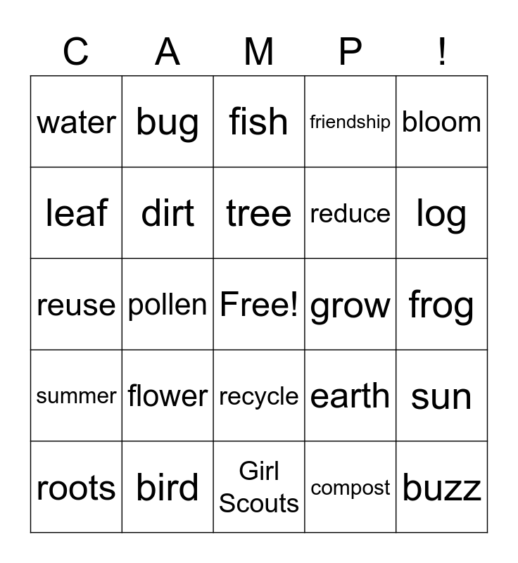 This bingo card has a free space and 24 words: flower, bird, tree, roots, bloom, water, leaf, bug, grow, recycle, reduce, reuse, earth, sun, dirt, compost, frog, fish, log, pollen, buzz, summer, friendship and Girl Scouts.