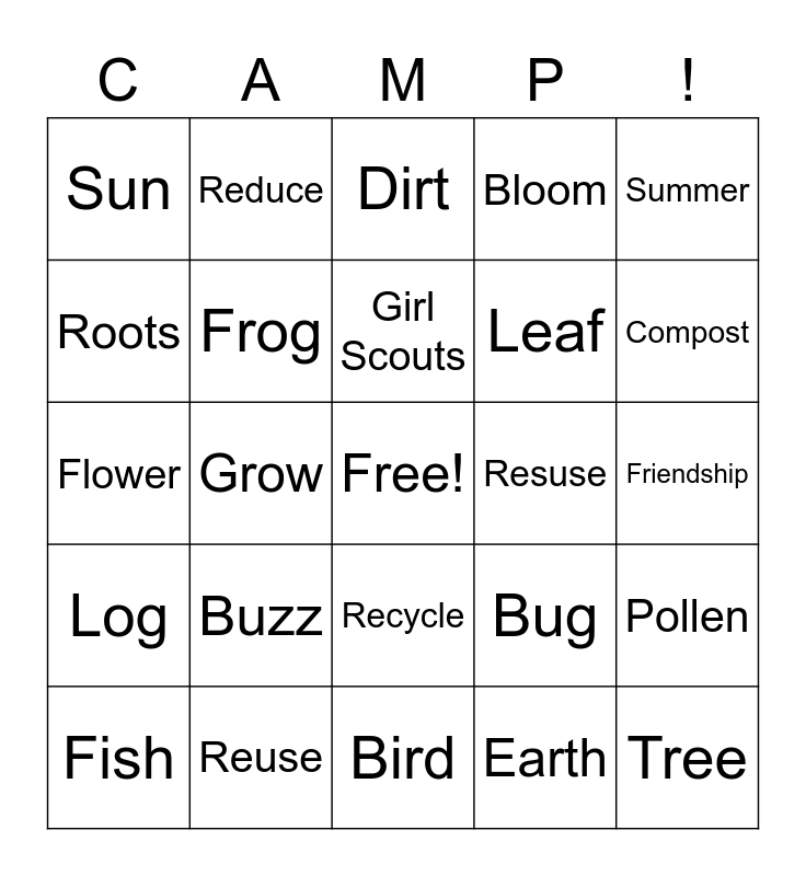 This bingo card has a free space and 24 words: Buzz, Reuse, Girl Scouts, Fish, Summer, Sun, Roots, Reduce, Resuse, Recycle, Leaf, Flower, Bug, Pollen, Frog, Earth, Friendship, Dirt, Compost, Grow, Tree, Log, Bloom and Bird.