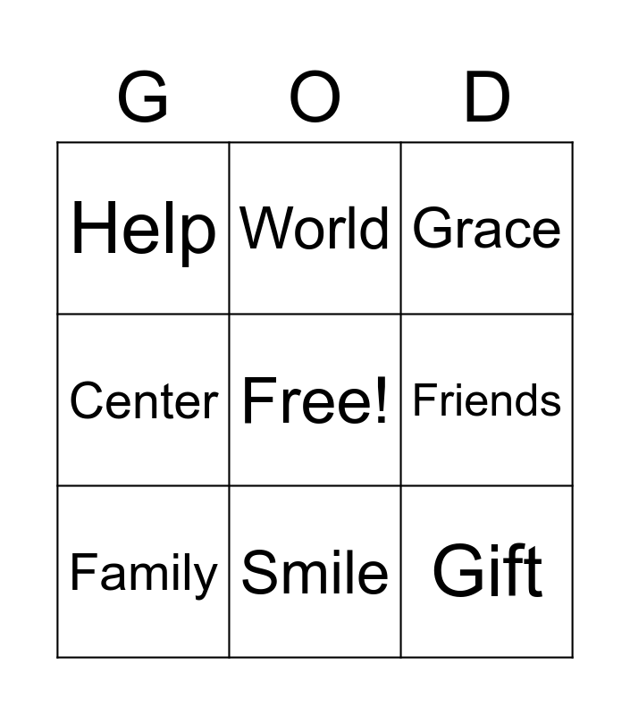 This bingo card has a free space and 11 words: Joy, Smile, Gift, Family, World, Grace, Friends, God, Center, Help and Honor.