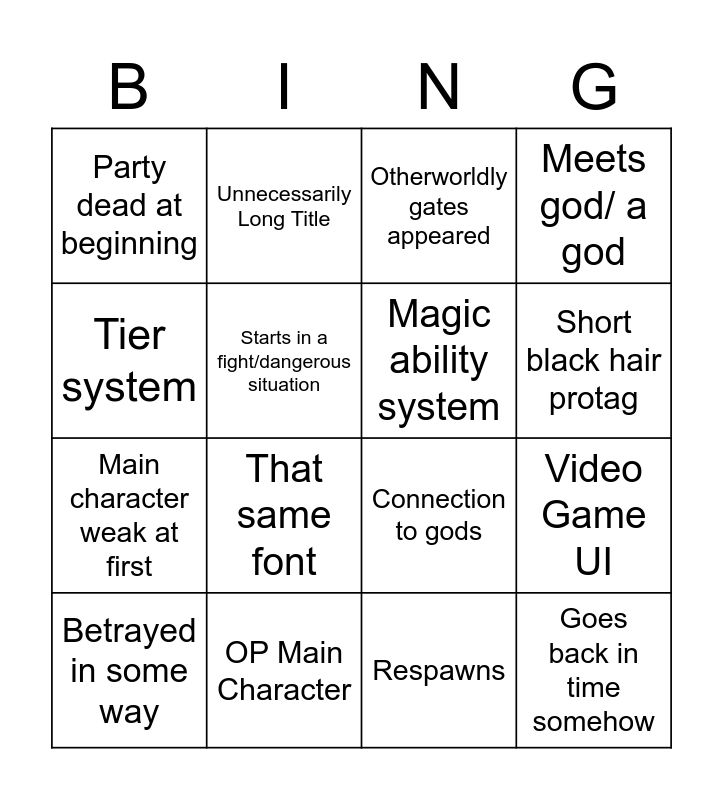 This bingo card has 16 words: OP Main Character, Video Game UI, Otherworldly gates appeared, Party dead at beginning, Main character weak at first, Unnecessarily Long Title, Connection to gods, Respawns, Tier system, Starts in a fight/dangerous situation, Betrayed in some way, Meets god/ a god, That same font, Short black hair protag, Magic ability system and Goes back in time somehow.