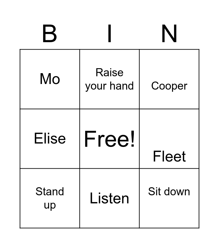 This bingo card has a free space and 11 words: Be quiet, Listen, Sit down, Stand up, Raise your hand, Cooper, Fleet, Tom Thunder, Elise, Mo and Dan.
