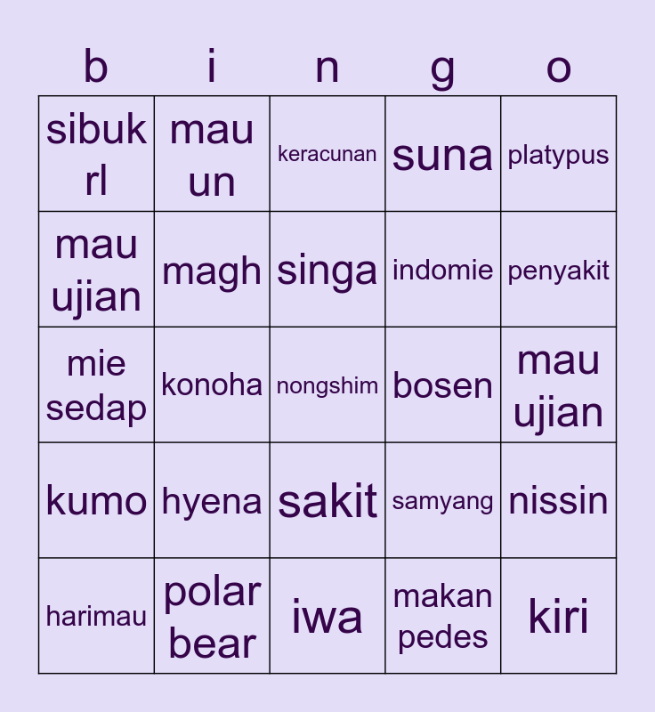 This bingo card has a free space and 24 words: hyena, polar bear, singa, harimau, platypus, sibuk rl, mau ujian, mau un, bosen, sakit, indomie, mie sedap, samyang, nissin, magh, makan pedes, mau ujian, keracunan, penyakit, konoha, kiri, kumo, suna and iwa.