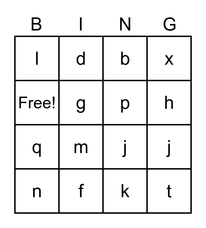 This bingo card has 16 words: f, j, b, l, q, d, j, k, Free!, g, n, x, m, h, p and t.