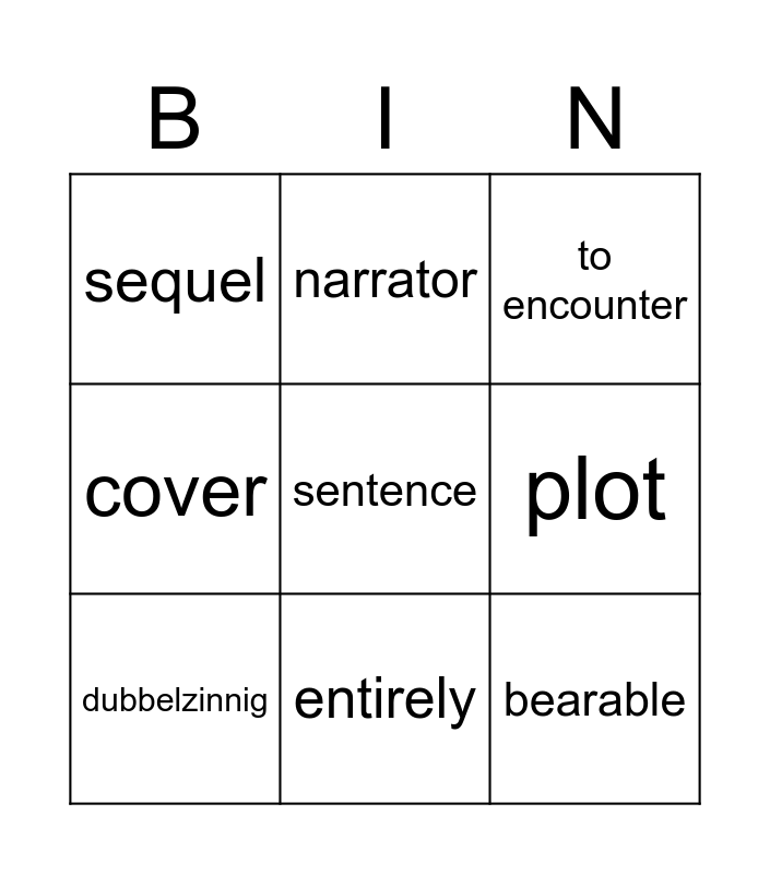 This bingo card has 34 words: awkard, hardback, to resist, predictabe, fragment, dubbelzinnig, sentence, accidentally, narrator, to dare, entirely, to encounter, wedding, uitzenden, onderdompelen, humdrum, to retain, to pretend, vreemd, expense, modest, to develop, sequel, fierce, majority, society, cover, armed, bearable, plot, numerous, alien, to transmit and opposite.