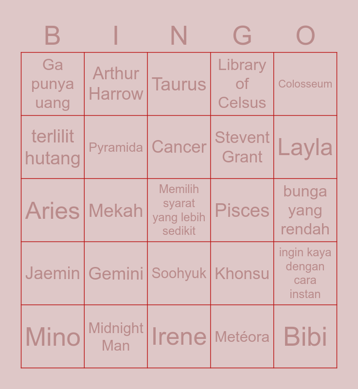This bingo card has 25 words: Gemini, Irene, Cancer, Mino, Colosseum, Ga punya uang, terlilit hutang, Arthur Harrow, Pisces, Soohyuk, Stevent Grant, Aries, Khonsu, ingin kaya dengan cara instan, Pyramida, Bibi, bunga yang rendah, Taurus, Layla, Mekah, Memilih syarat yang lebih sedikit, Midnight Man, Jaemin, Library of Celsus and Metéora.
