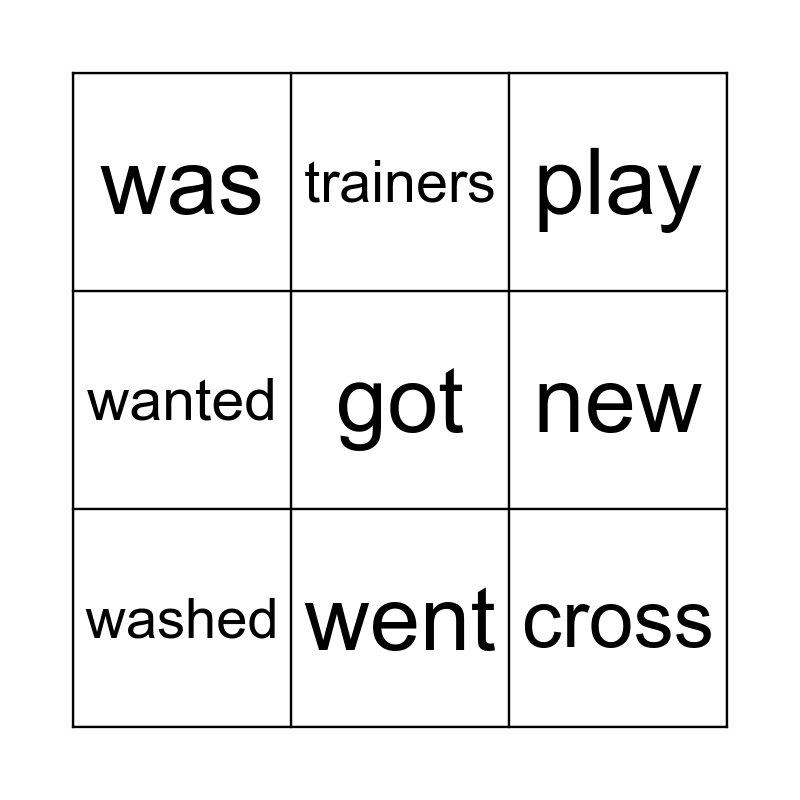 This bingo card has 12 words: dad, cross, got, new, trainers, play, went, the, was, wanted, washed and he.