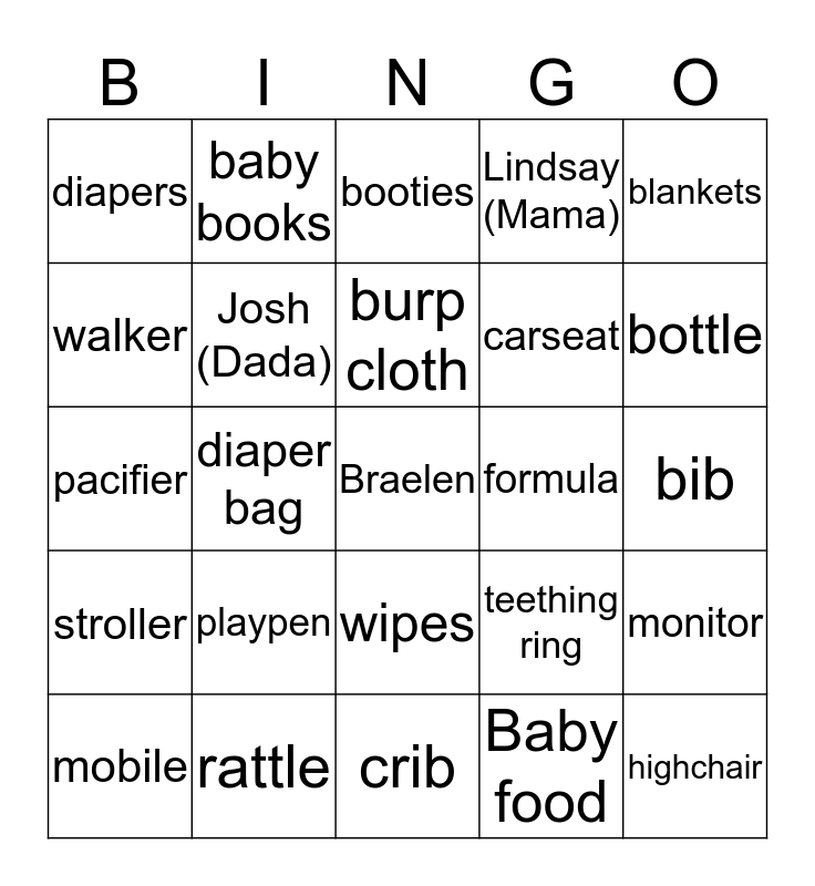 This bingo card has a free space and 24 words: playpen, rattle, burp cloth, mobile, blankets, diapers, walker, baby books, formula, wipes, carseat, pacifier, teething ring, monitor, Josh (Dada), Baby food, bib, booties, bottle, diaper bag, highchair, stroller, Lindsay (Mama) and crib.
