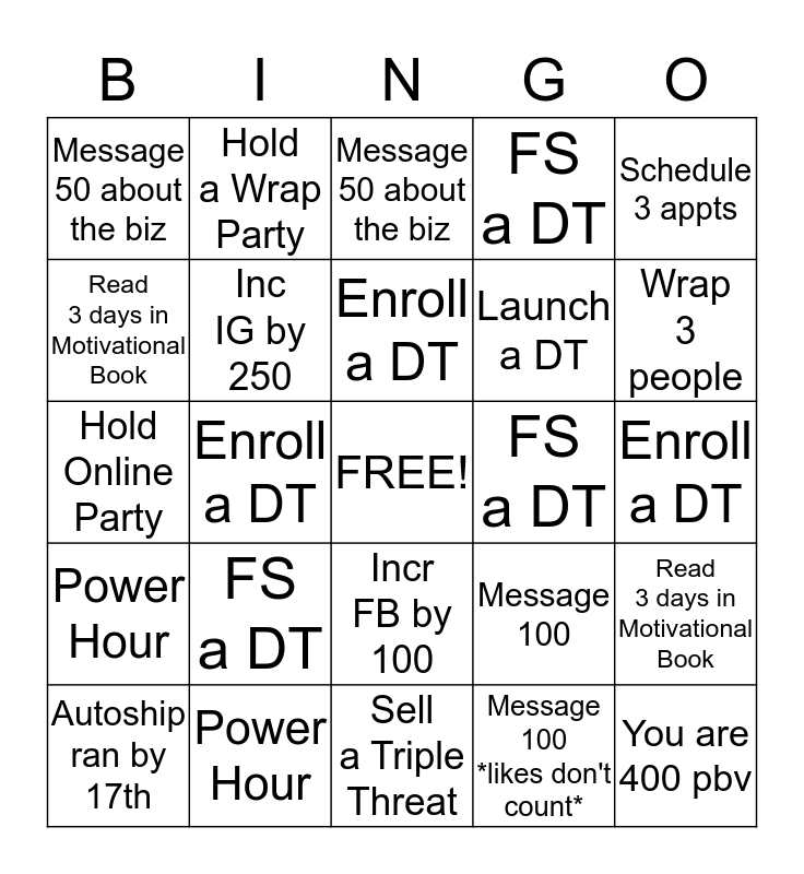 This bingo card has a free space and 24 words: FS a DT, Power Hour, Enroll a DT, Autoship ran by 17th, Schedule 3 appts, Message 50 about the biz, Read 3 days in Motivational Book, Hold a Wrap Party, FS a DT, Incr FB by 100, Launch a DT, Hold Online Party, Message 100, Read 3 days in Motivational Book, Inc IG by 250, Message 100 *likes don't count*, Enroll a DT, Message 50 about the biz, Wrap 3 people, Enroll a DT, You are 400 pbv, Power Hour, FS a DT and Sell a Triple Threat.