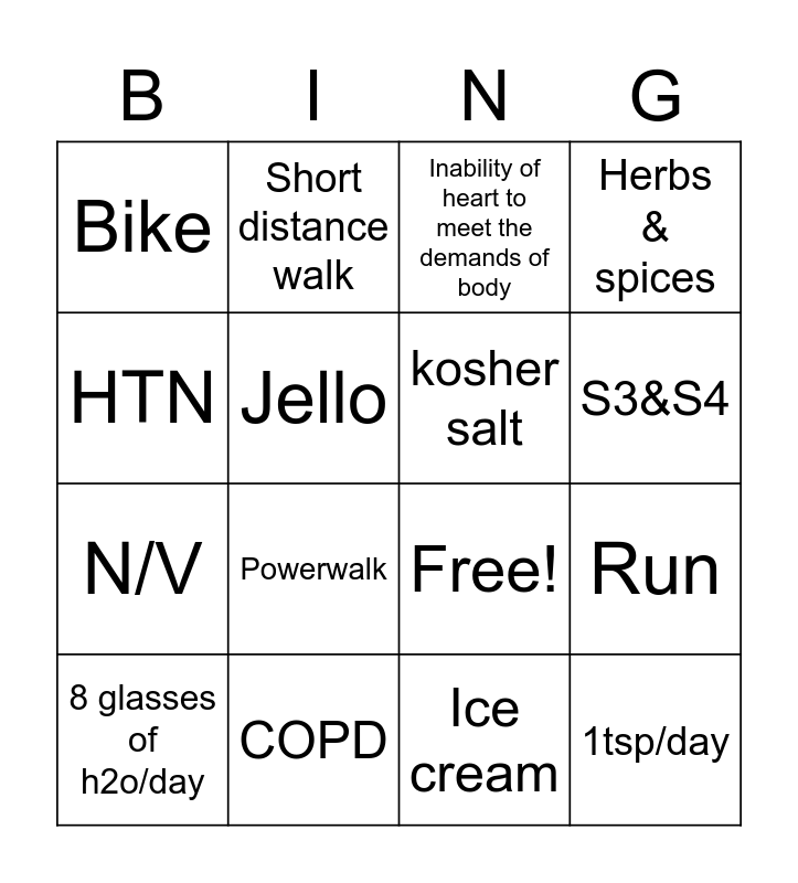 This bingo card has 16 words: COPD, Run, Inability of heart to meet the demands of body, Bike, N/V, Short distance walk, Free!, Ice cream, HTN, Jello, 8 glasses of h2o/day, Herbs & spices, Powerwalk, S3&S4, kosher salt and 1tsp/day.