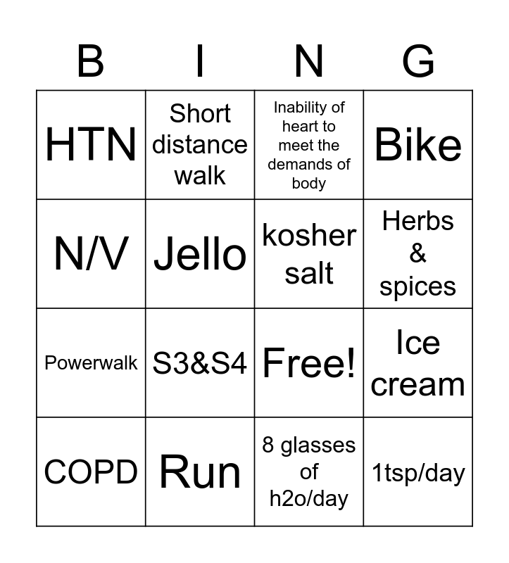 This bingo card has 16 words: COPD, Run, Inability of heart to meet the demands of body, Bike, N/V, Short distance walk, Free!, Ice cream, HTN, Jello, 8 glasses of h2o/day, Herbs & spices, Powerwalk, S3&S4, kosher salt and 1tsp/day.