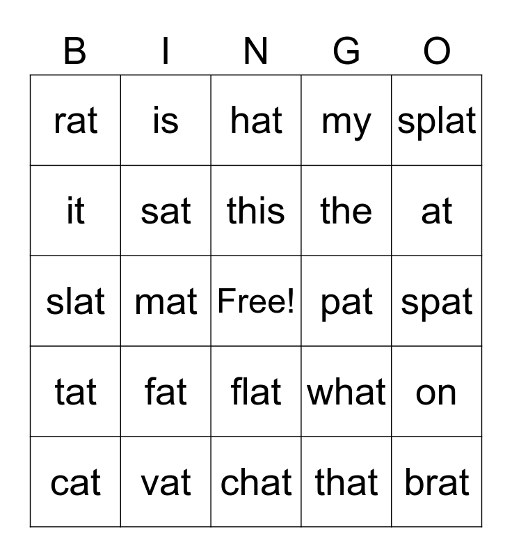 This bingo card has a free space and 29 words: cat, bat, mat, lat, rat, hat, sat, fat, pat, vat, spat, brat, chat, that, at, scat, flat, tat, splat, slat, what, did, the, it, my, is, on, this and in.